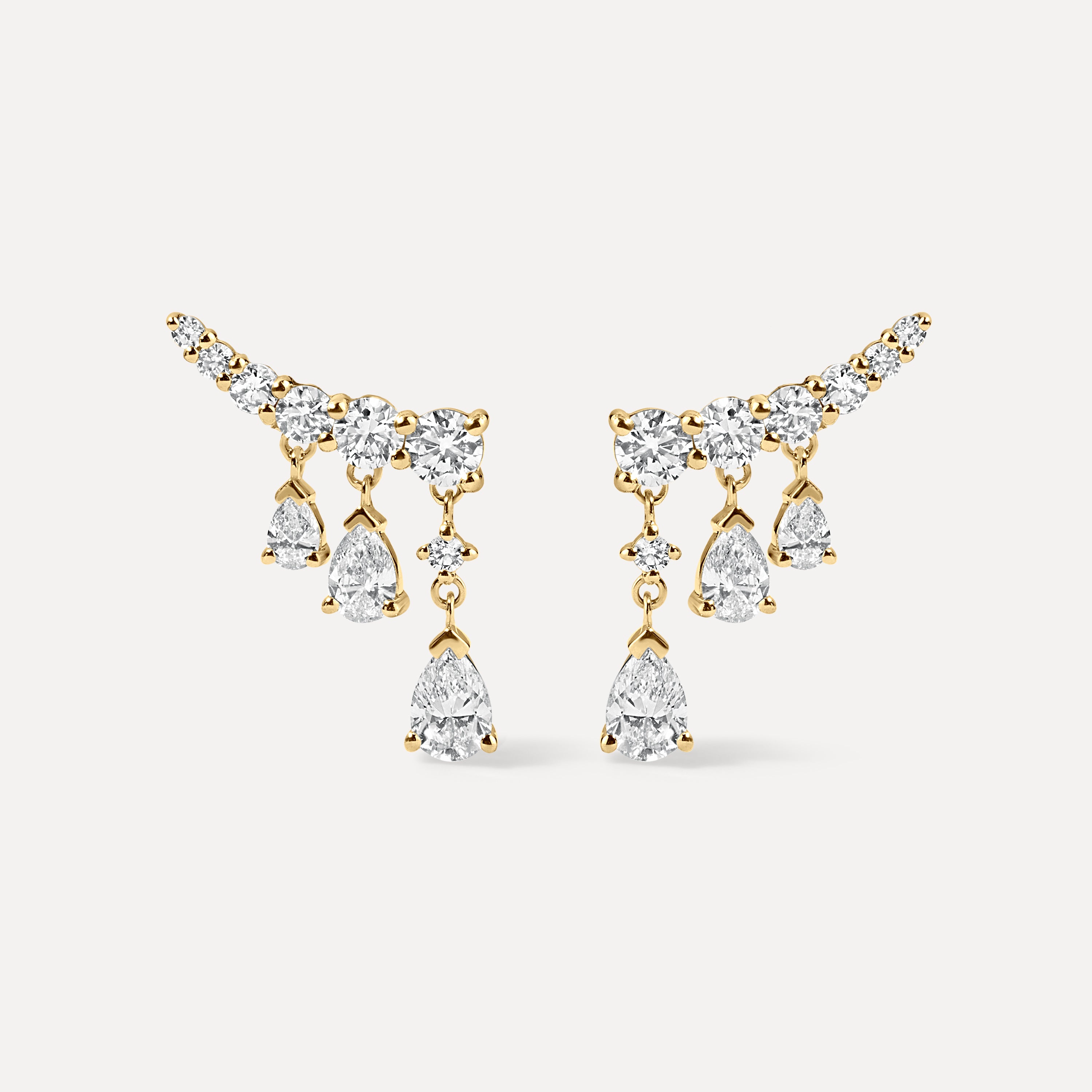 Elevate your everyday elegance with our Cascade Pear & Round Diamond Earrings, crafted in 14k solid gold and designed to mesmerize from every angle. A graceful curve of round lab diamonds hugs the ear, while three perfectly suspended pear-shaped lab diamonds dance below—catching the light with every move.