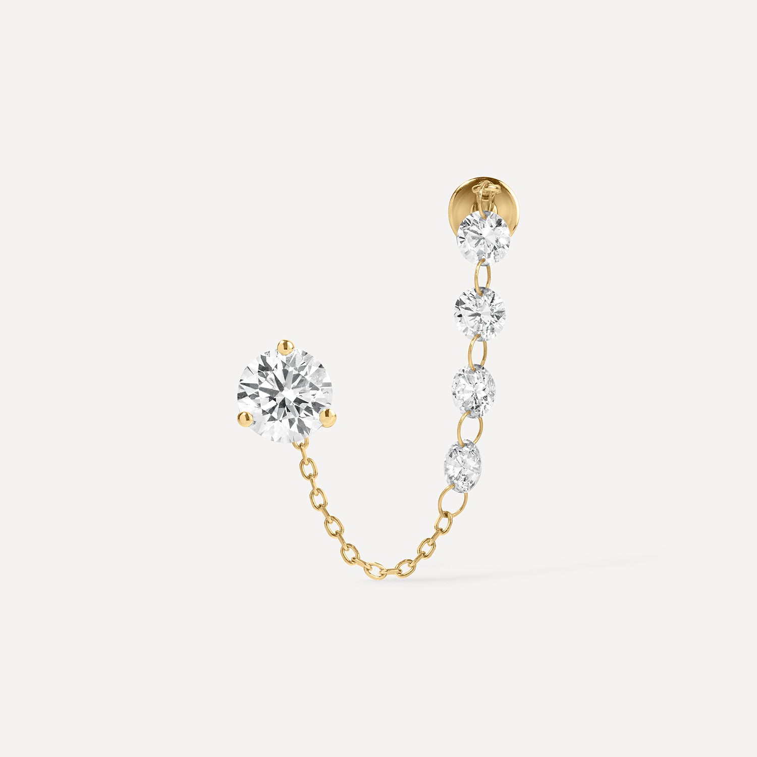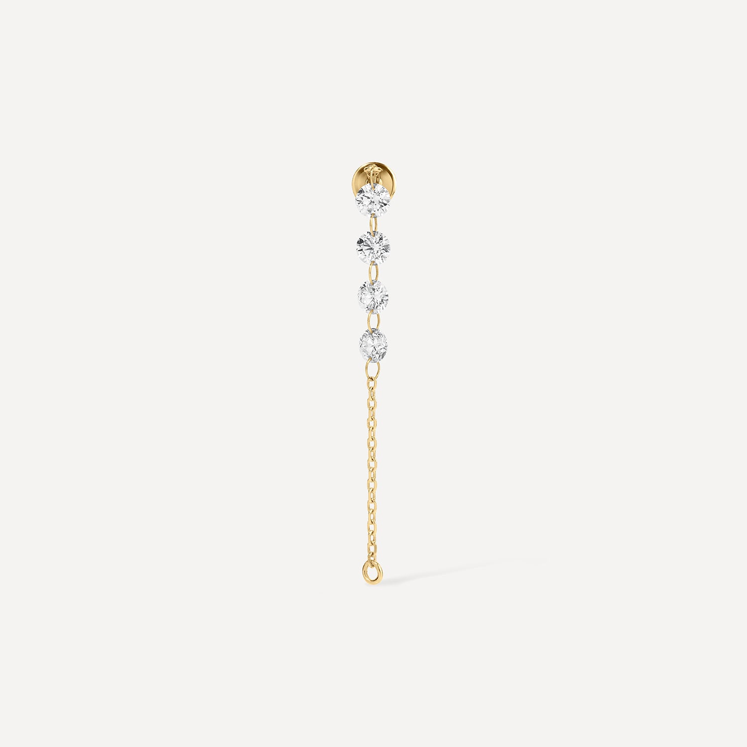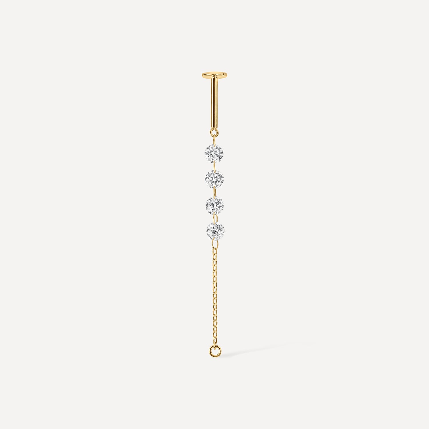 The Floating Diamond Threaded Chain Connector is designed to link piercings on the same ear with subtle movement and refined sparkle. Crafted in solid 14k gold, one end features a flat-back threaded post, while the delicate chain is accented with floating diamond details.