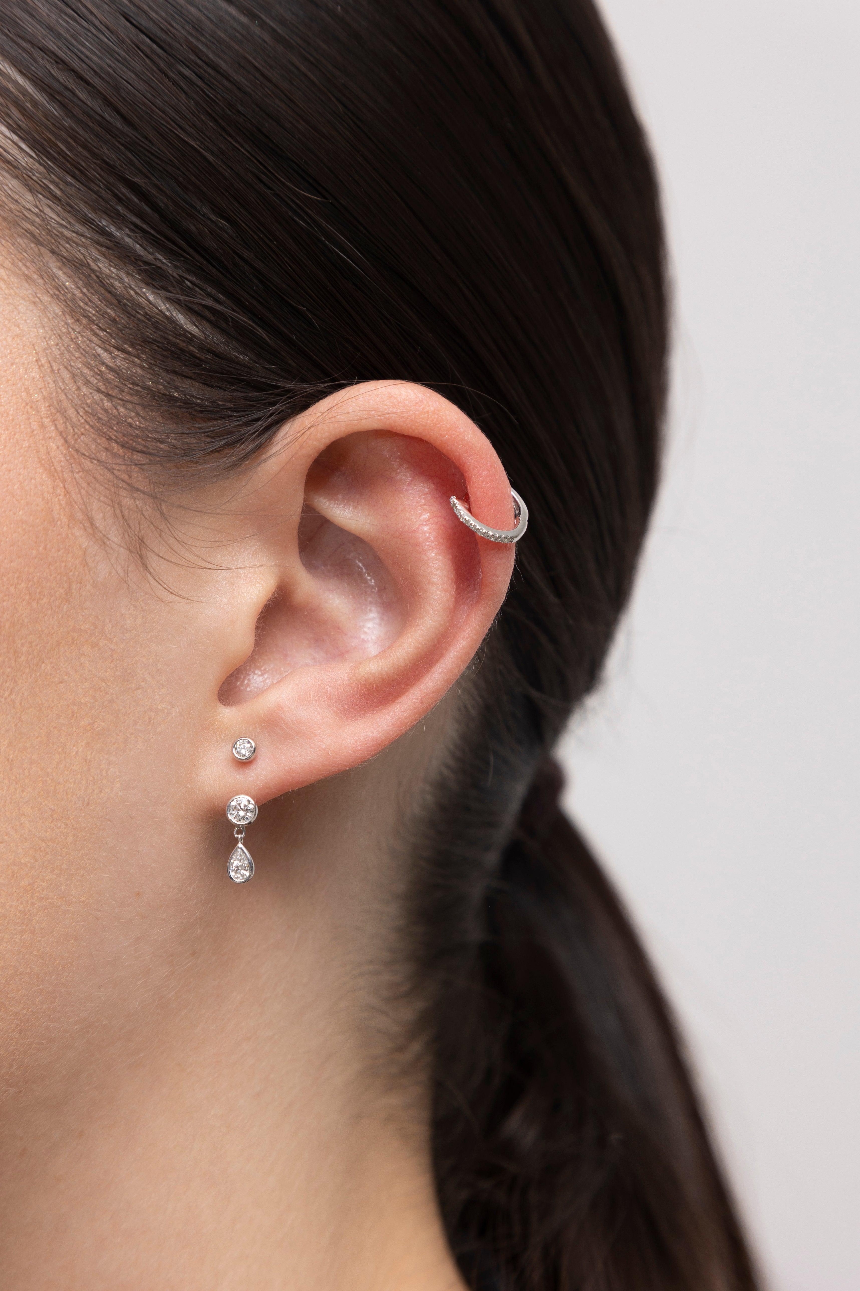 Nuestros Huggies Mini de Diamantes para uso diario en oro de 14k tienen pavé de diamantes blancos. Son delicados y cubren perfectamente la oreja. También se pueden usar al revés para lograr una apariencia de oro macizo.
