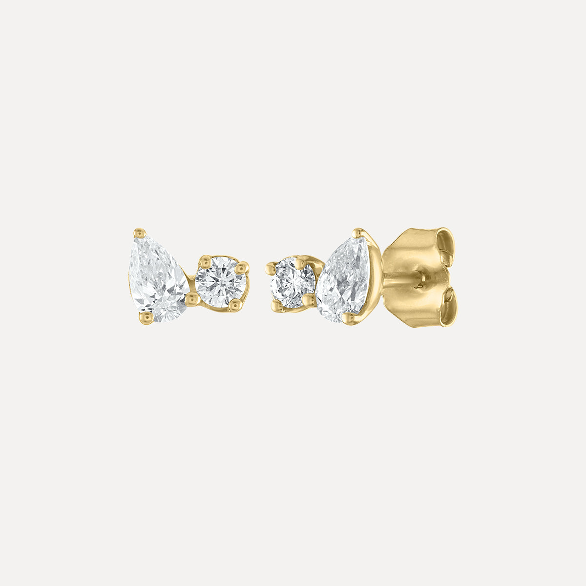 Estos minimalistas pero impactantes Aretes Noa Doble Diamantes Mixtos en oro de 14 quilates son el complemento perfecto para cualquier juego de aretes. Cuenta con un diamante redondo y otro en forma de pera. Estos simbolizan el amor de dos personas.